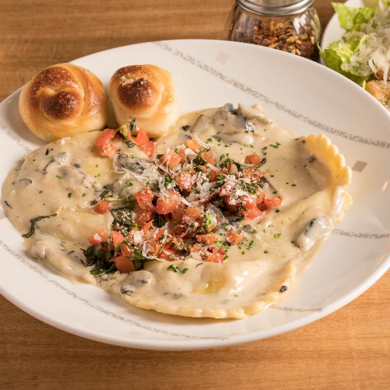 5 jumbo ravioli stuffed with ricotta, served with creamy mushroom sauce and spinach, topped with bruschetta and shredded Parmesan cheese.